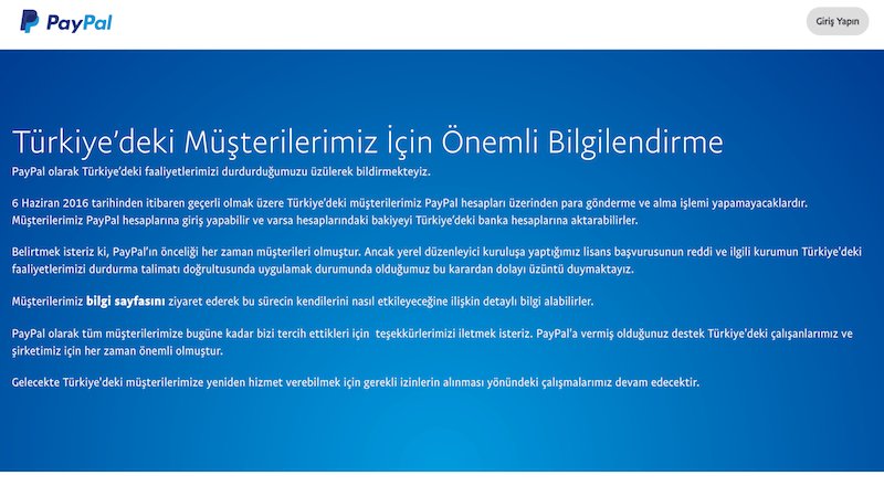 PayPal’dan para gönderme ve alma işlemlerini 6 Haziran’a kadar durduruyor olması ülkemizdeki e-Ticaret faaliyetlerini de ciddi anlamda etkileyecektir. Bilhassa bilişim sektörünün entegrasyonlarla kullandığı PayPal API ödeme ayarları artık böylelikle boşa çıkıyor oldu. Türkiye’deki müşterilerini yine de üzmemek adına içeride olan bakiyelerini kullanana dek esneklik tanıyacağını açıklayan PayPal 203 ülke de verdiği hizmeti böylelikle 202 ülke de vermeye devam edecek.